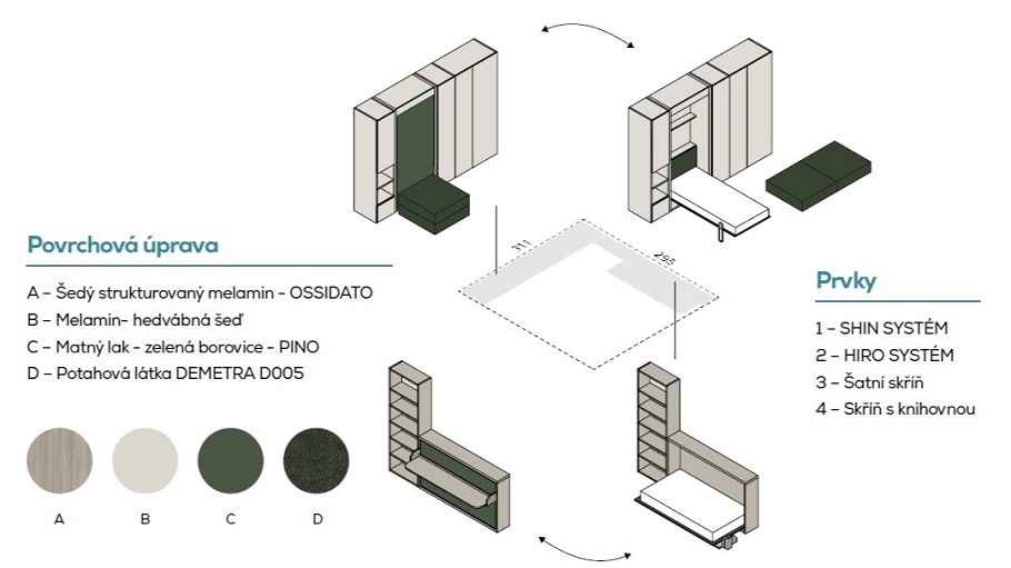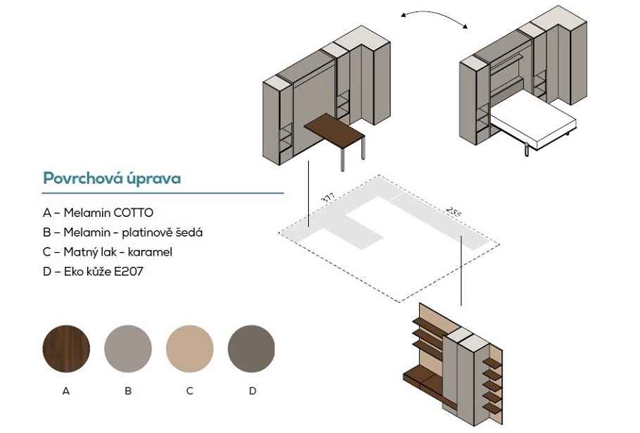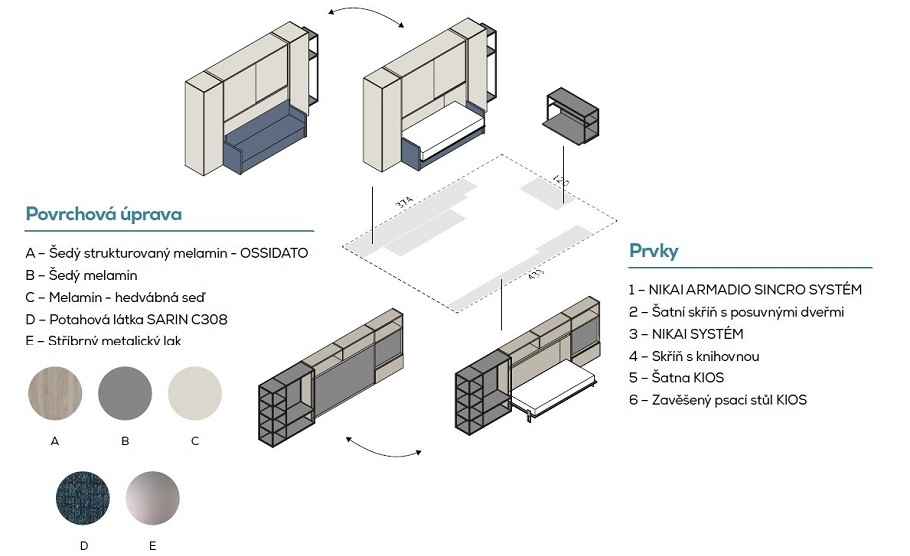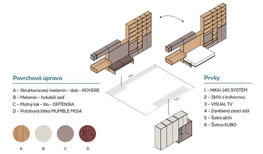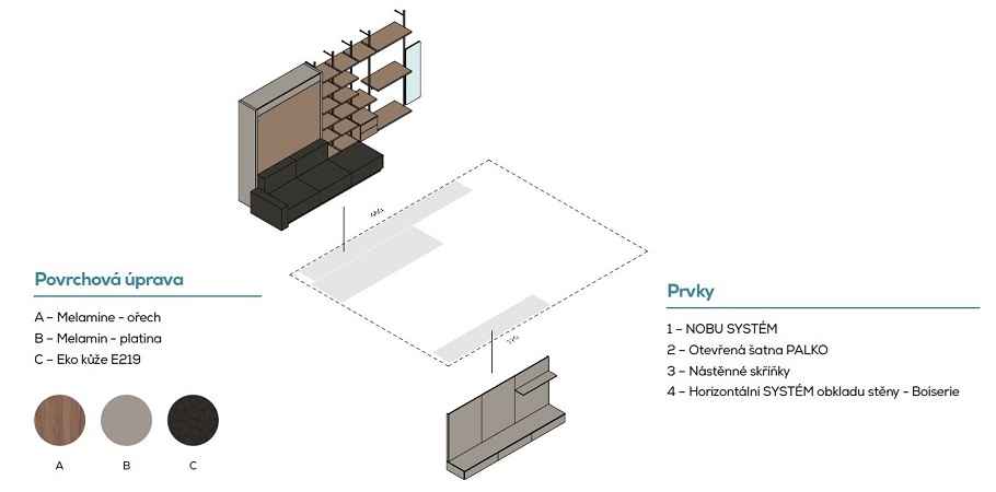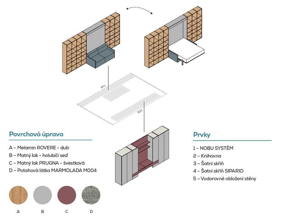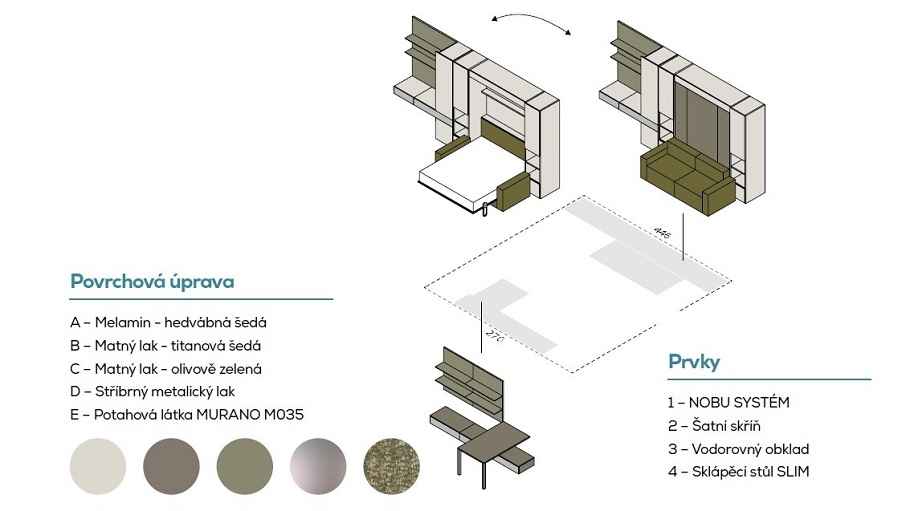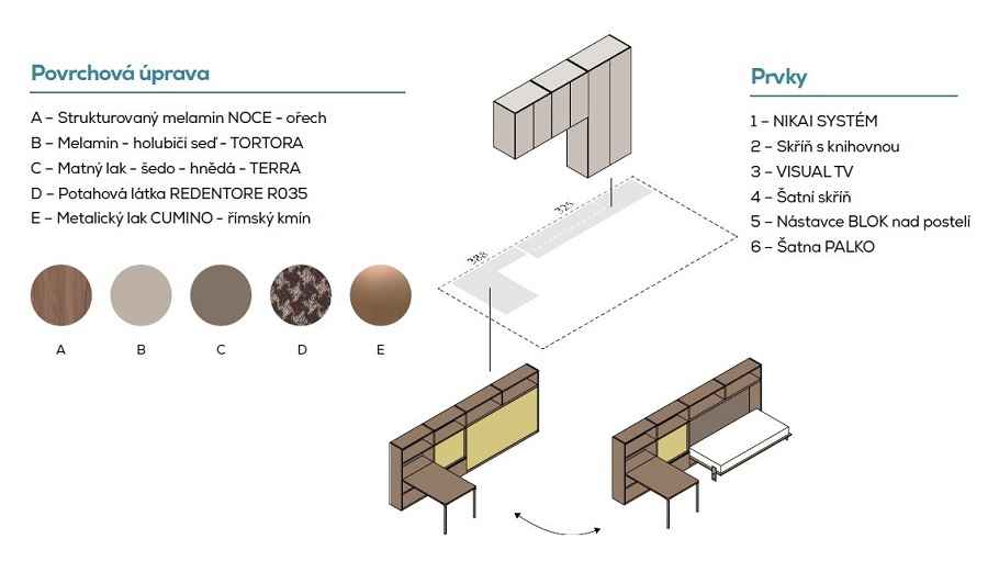 IM22-02 NOBU - sklápěcí postel s pohovkou, doplěná šatnou PALKO a a TV stěnou